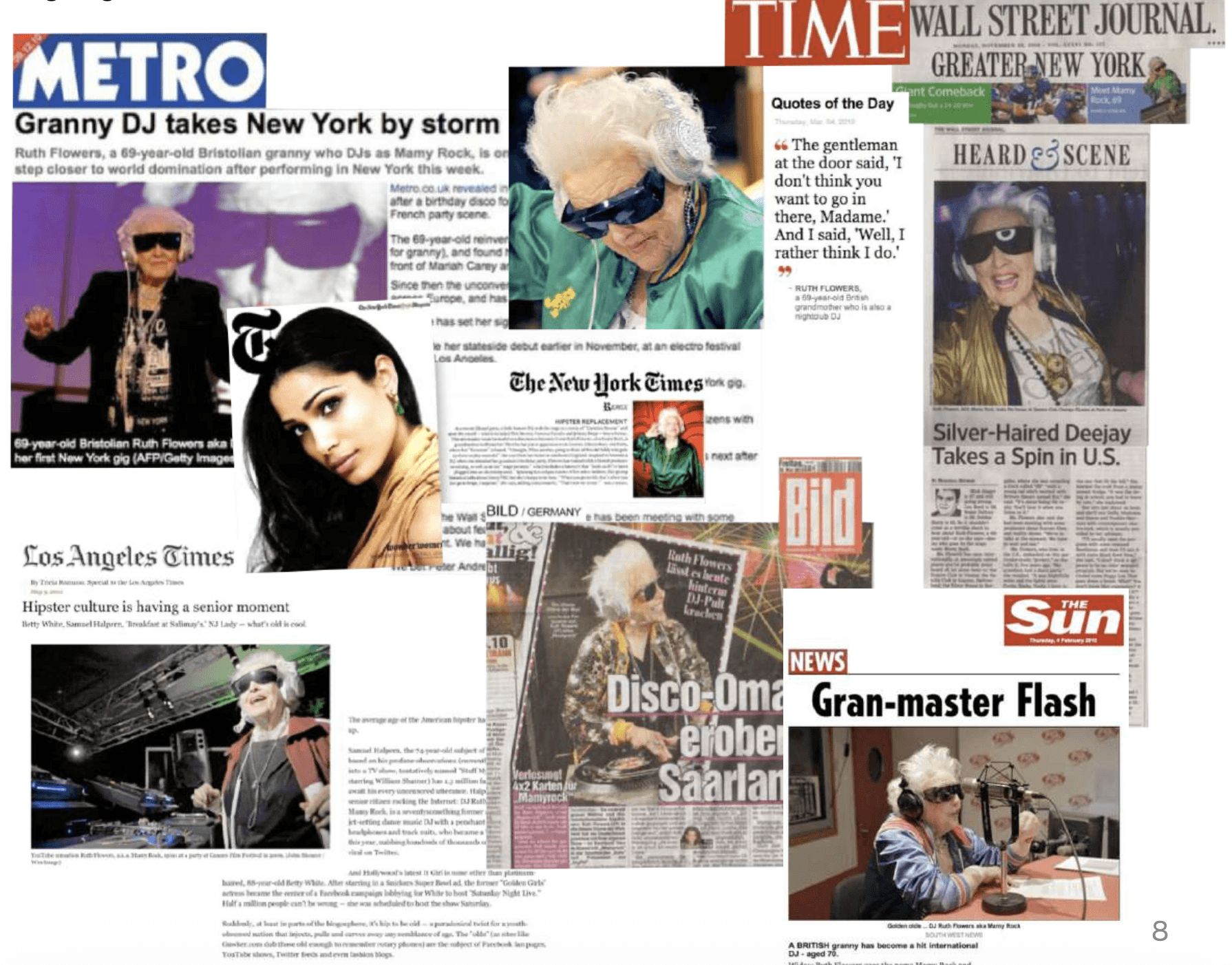 Ruth Flowers, grand-mère britannique vivant paisiblement près de Bristol, décide à 80 ans de devenir DJ après l’anniversaire de son petit-fils. Quelques mois plus tard, son alter ego Mamy Rock devient une sensation mondiale. Pendant 6 ans, Spoa® a suivi cette trajectoire hors norme : des clubs parisiens aux scènes de Los Angeles, Tokyo, New York, Australie, Chine ou Singapour. Près de 500 performances internationales, une couverture presse mondiale (The Guardian, Time, Wall Street Journal…) et un phénomène culturel intergénérationnel inattendu.